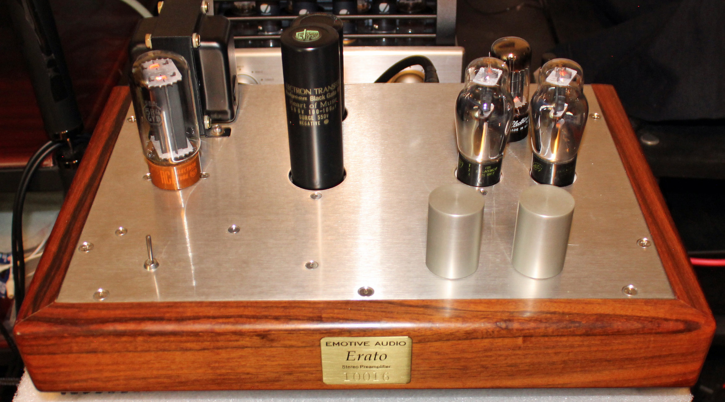 Because the cut outs in the Erato’s aluminum top deck are sized for the smaller ST-12 type 27, I was limited to evaluating several such types in the context of the Erato. The RCA Radiotron and Sylvania brands sound great, but a recent acquisition, a pair of National Union mesh plate types that likely date from around 1933 are sonically to die for: plush, dimensional, focused, and super seductive.