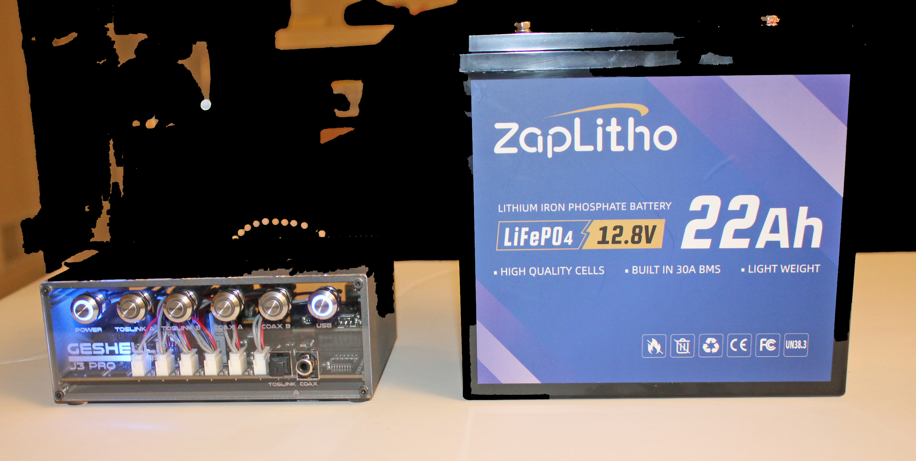 It has been my experience that the power supply is responsible for a big slice of the sonic pie when it comes to DAC design, the actual chip set used contributing only a fraction to the total. I’m not a fan of switching-mode wall-wart power supplies. So the stock wall-wart was quickly replaced by a 12VDC linear power supply. It made for an immediate improvement, smoothing out musical textures, expanding soundstage dimensions, and improving image focus. It took a while, a few months to be exact, for the switch to a Lithium Iron Phosphate Battery rated at 22 Ah and 12.8VDC. It uses 4 cells wired in series, each providing 3.2 VDC. Yes, ZapLitho (cool name) is a Chinese brand that I sourced off Amazon for a reasonable price. Fully charged the voltage measured 13.4VDC and settled at 13.1VDC after a couple of hours of use. Its built-in voltage display is quite useful for confirming battery status. I’m estimating about 100 hours between charging cycles. However, I found it necessary to disconnect the power cable after each use, or else the battery would discharge quite rapidly to 10VDC in 24 hours. The battery is connected to the J3 via a 1-meter long 22-gauge cable, terminated with a 5.5mm x 2.5mm barrel male plug and bare wire at the battery terminals.